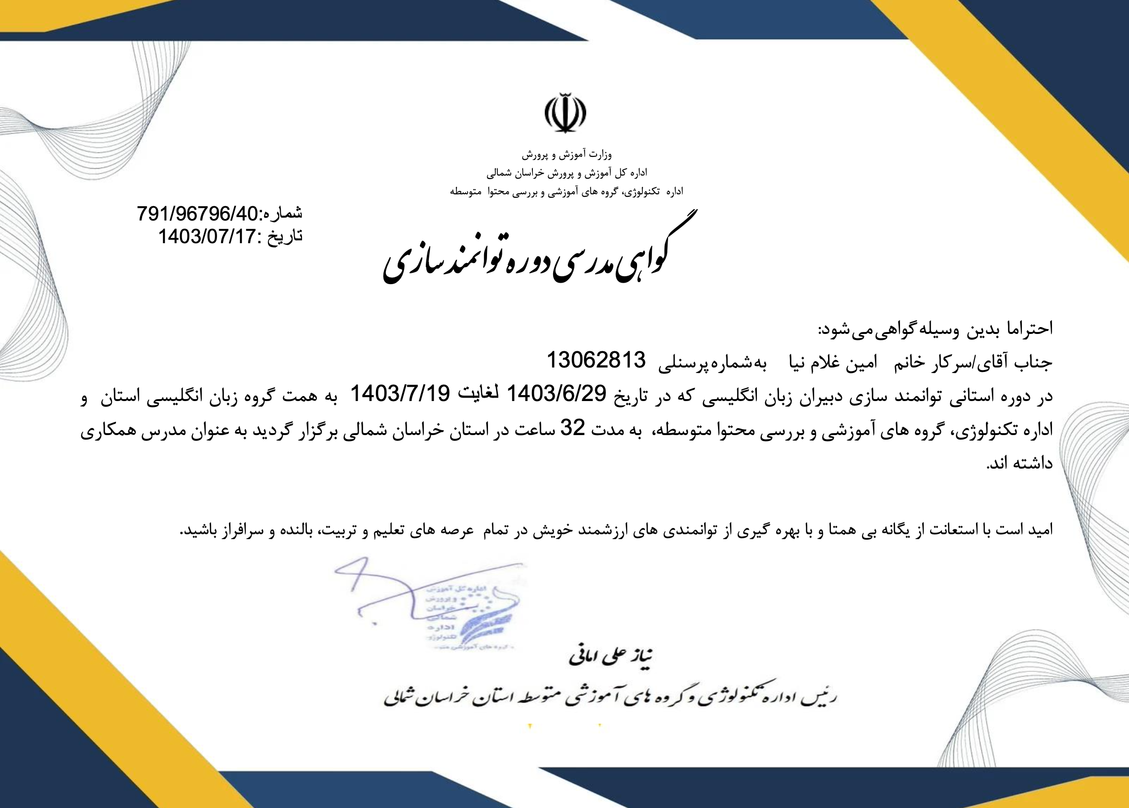دبیر رسمی زبان انگلیسی مدرس دوره های ضمن خدمت بجنورد